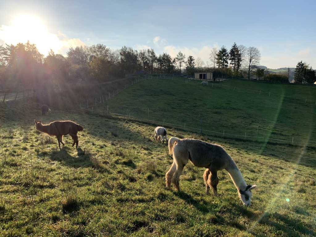 Gerade die Schönecker Schweiz ist sehr hügelig, fast schon bergig. Tief hat sich der Altburger Bach eingegraben. Auf den Hochebenen zwischen Prüm und Bitburg kannst du weite Ausblicke in die idyllische Landschaft genießen. Auch die Lamas lieben solche Aussichten. Oft steht die Herde auf der sanft geneigten Weide und schaut mit ihren großen Kulleraugen hinüber zur Schönecker Burg. Das Panorama über die umliegenen Wiesen und Wälder scheinen sie geradezu zu genießen.