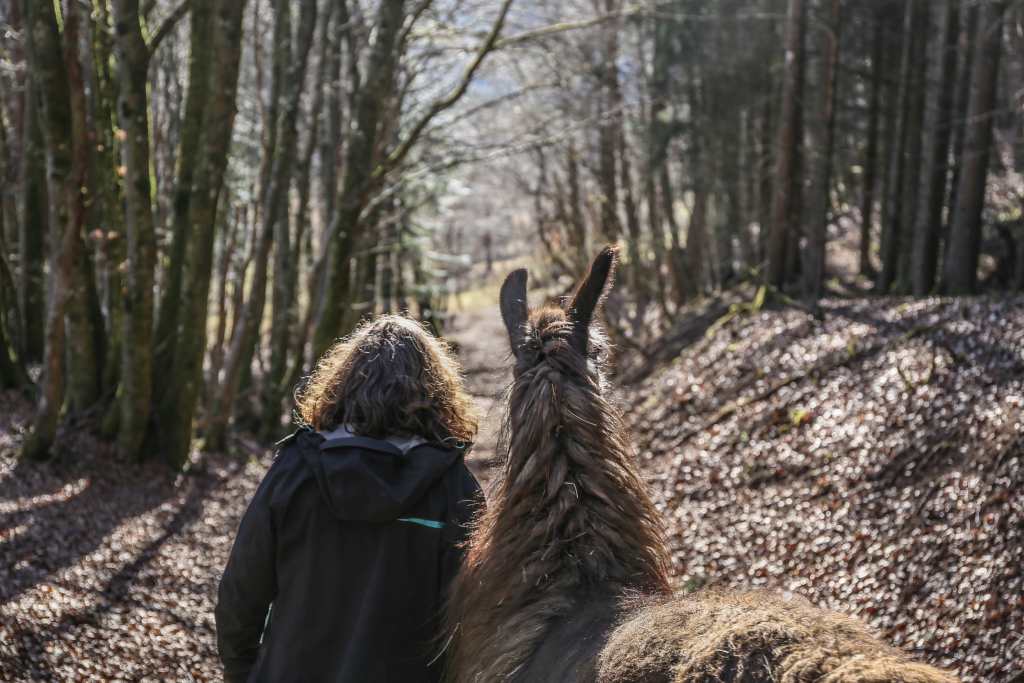 Aber keine Angst, wir Lamas sprechen mit euch Zweibeinern. Ihr müsst uns nur verstehen und -zack- gelingt die Lama Wanderung. Prompt sagt die Lockige von den eifelnomaden: „Schaut auf ihre Ohren und den Schwanz. Wenn die Ohren nach vorne zeigen und der Schwanz runterhängt, ist das Lama entspannt. Wenn es aber die Ohren nach hinten legt und den Schwanz anhebt, ist es nervös und unsicher geworden. Vielleicht bist du ihm dann zu nahe gekommen.“ Ha! Sie kennt unsere Sprache. Deshalb sie so genau weiß, wie es uns geht.
